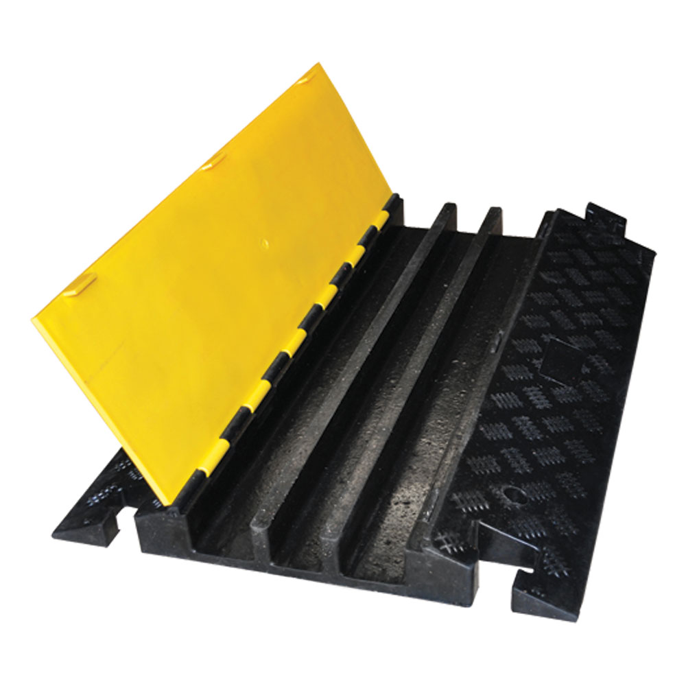 Kabelbrygga för att skydda elkablar över vägar och passage på byggarbetsplatser eller event. Max 5 ton per hjulaxel. Tre kanaler, vardera 55x60mm