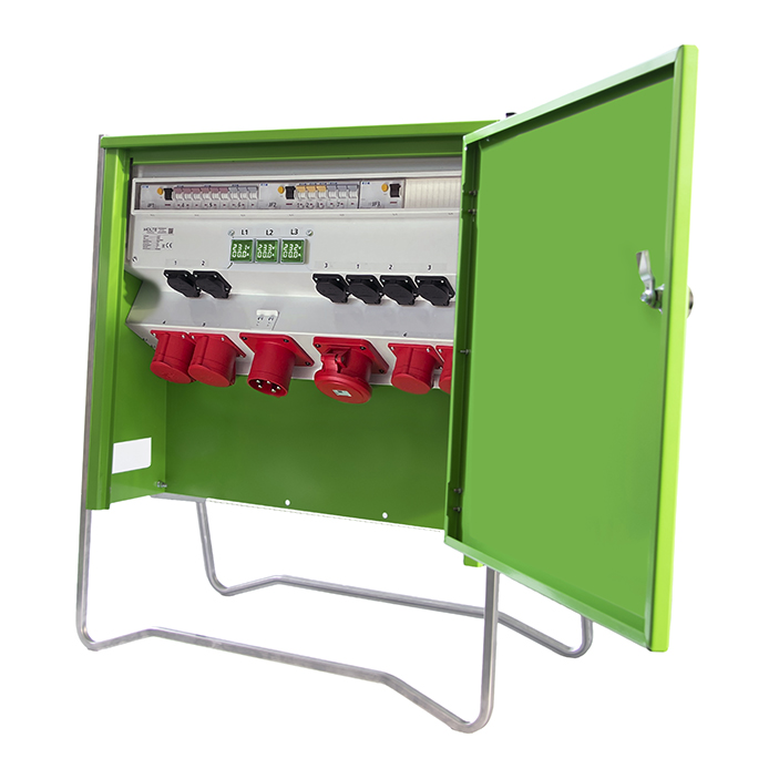 - Bestyckning: Intag 63A/400V, Uttag 1x63A/400V, 2x32A/400V, 2x16A/400V, 6x13A/230V